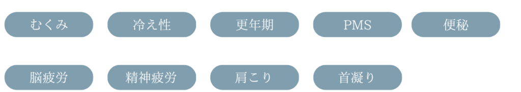 むくみ、冷え性、更年期、PMS,便秘、肩こり